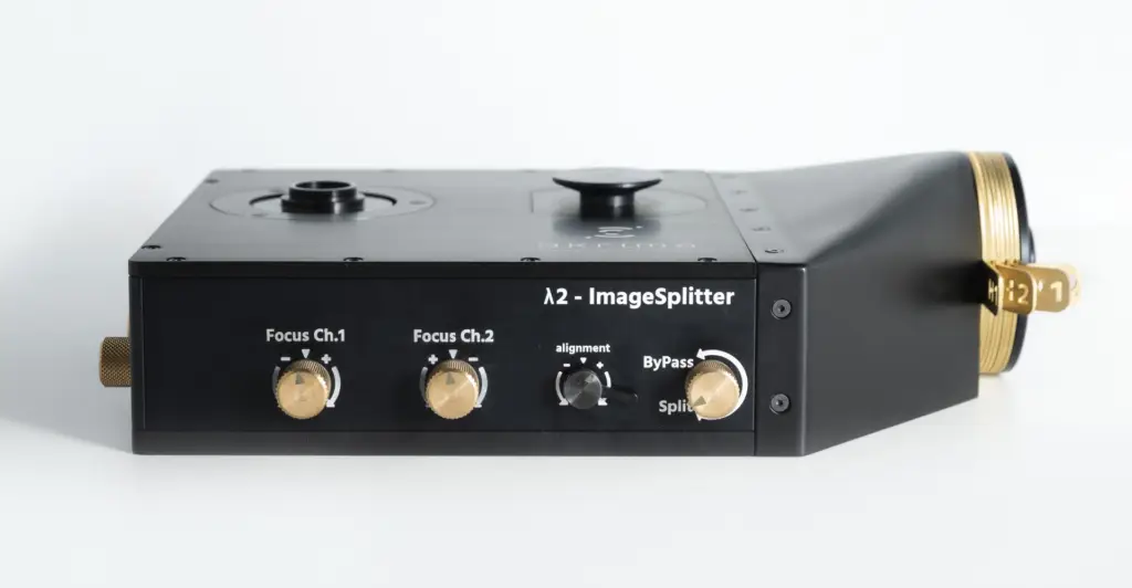 The Akrima Lambda 2 (λ2) Image Splitter Integrates seamlessly into your imaging system. The Lambda 2 splits a single optical path into two distinct, high-resolution channels, enabling simultaneous multi-wavelength imaging or dual-camera setups with zero compromise on alignment or light throughput.